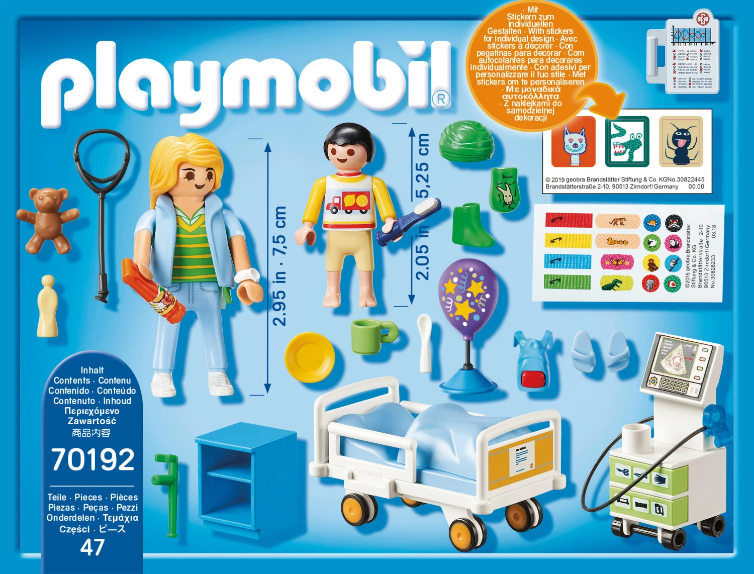 Im fröhlich eingerichteten Kinderkrankenzimmer werden auch die kleinsten Patienten schnell wieder gesund. Ein kuscheliger Teddybär spendet Trost und im mobilen Kinderkrankenbett lässt es sich nach der Untersuchung gut schlafen. Kleidung, Rucksack und Waschutensilien finden im Schränkchen neben dem Bett Platz. Heute untersucht die Ärztin nochmals den verletzten Arm und das Bein. Bald kann der Gips abgenommen werden! Bis dahin malt der kleine Junge noch ein paar Bilder und hängt sie zur Verschönerung an die Wand. So ist schon eine erstaunliche kleine Bildergalerie entstanden. Natürlich will er alle Kunstwerke mitnehmen, wenn er wieder nach Hause darf. Das Spielset enthält ein Kinderkrankenzimmer mit zwei PLAYMOBIL®-Figuren, einem rollbaren Krankenbett, einem Röntgengerät, einem Schränkchen, zwei Stickerbögen und vielen weitere Extras. Die Wandbilder und Pflaster auf den Stickerbögen können wiederverwendet werden.