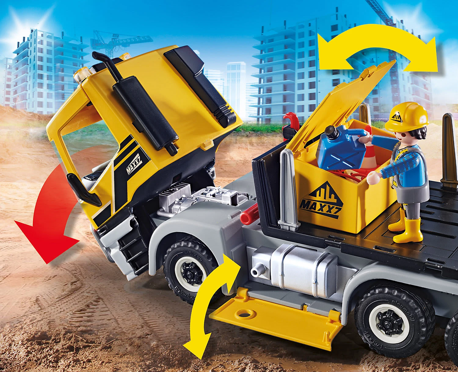 Auf der Baustelle ist immer viel zu tun! Heute kommt der große LKW, um das Schüttgut und den Unrat abzutransportieren. Mit dem umfassenden Spieleset PLAYMOBIL® LKW mit Wechselaufbau (70444) können kreative Geschichten erfunden und Alltagswahrnehmungen nachgespielt werden. Der große Laster begeistert mit vielen coolen Details und einem austauschbaren Aufsatz: Entweder wird der Aufbau zum Transport von Sackware oder die Mulde zum Transport von Schüttgut eingesetzt. Langsam und vorsichtig fährt der Bauarbeiter den Laster rückwärts in die Baustellen-Einfahrt, um seine Arbeit zu machen. Aber was ist das für ein Geräusch? Er muss nach dem Motor schauen und lässt vorsichtig das Fahrerhaus nach vorne. Mit in dem Set enthalten sind neben dem umbaubaren Laster und der Bauarbeiter-Spielefigur zahlreiche Zubehörteile für kreative Spielemomente auf der Kinderzimmer-Baustelle.