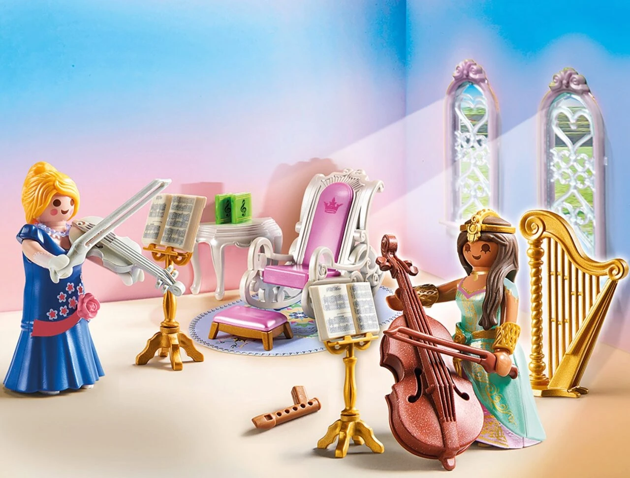Figuren: 2 Prinzessinnen Zubehör: 1 Schaukelstuhl, 1 Fußbank, 1 Teppich, 1 Harfe, 1 Kontrabass mit Bogen, 1 Geige mit Bogen, 1 Blockflöte, 1 Schemel, 1 Beistelltisch, 2 Notenständer, 2 Notenbücher, 2 Musikbücher, 1 Kleid mit Blüte (2-teilig), 1 Reifrock mit Gürtel, 1 Kette, 1 Diadem, 1 Paar Armmanschetten