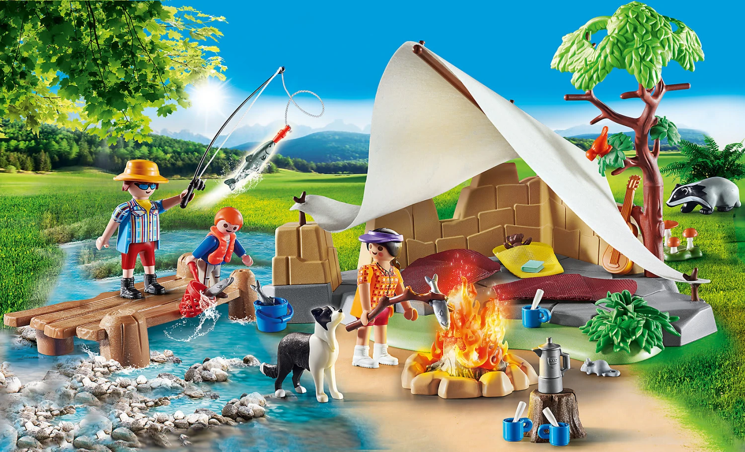 Ein Campingausflug mit der ganzen Familie, das bedeutet Abenteuer, Natur und Schlafen unterm Sternenhimmel. Nachdem das Nachtlager aufgeschlagen ist, wird ein Feuer in der Feuerstelle angezündet und eine Kanne Kaffee gekocht. Die Familie macht sich sofort auf ans Wasser und versucht ein paar Fische für das Abendessen zu fangen. Natürlich ist ihr treuer Hund immer an ihrer Seite. So macht Camping Spaß! Das Spielset enthält drei PLAYMOBIL-Figuren, einen Hund, eine Feuerstelle, eine Bodenplatte mit Mauerruine und Zeltplane, Schlafsäcke, eine Angel und viele weiter Extras für tolle Campingabenteuer.