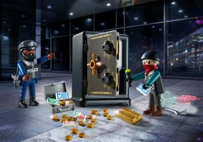 Mit seinem Werkzeug versucht der Tresorknacker den Tresor zu öffnen. Aber die Polizei hat davon Wind bekommen und ein Polizist macht sich auf den Weg den Einbrecher aufzuhalten. Mit dem umfassenden Spieleset PLAYMOBIL® Starter Pack Tresorknacker (70908) geht es auf zu neuen Abenteuern. In dem Tresor liegen viele wertvolle Gegenstände. Hier werden Geld, Goldmünzen und sogar Goldbarren verwahrt. Wird es der Dieb schaffen die Kombination des Tresors zu erraten, oder reicht ihm sein Brecheisen? Und wird der Polizist etwas gegen den vermummten Safeknacker unternehmen können? Mit in dem Set enthalten sind ein Tresor mit drehbaren Knöpfen, zwei Spielefiguren und jede Menge Zubehör für kreative Spielemomente.