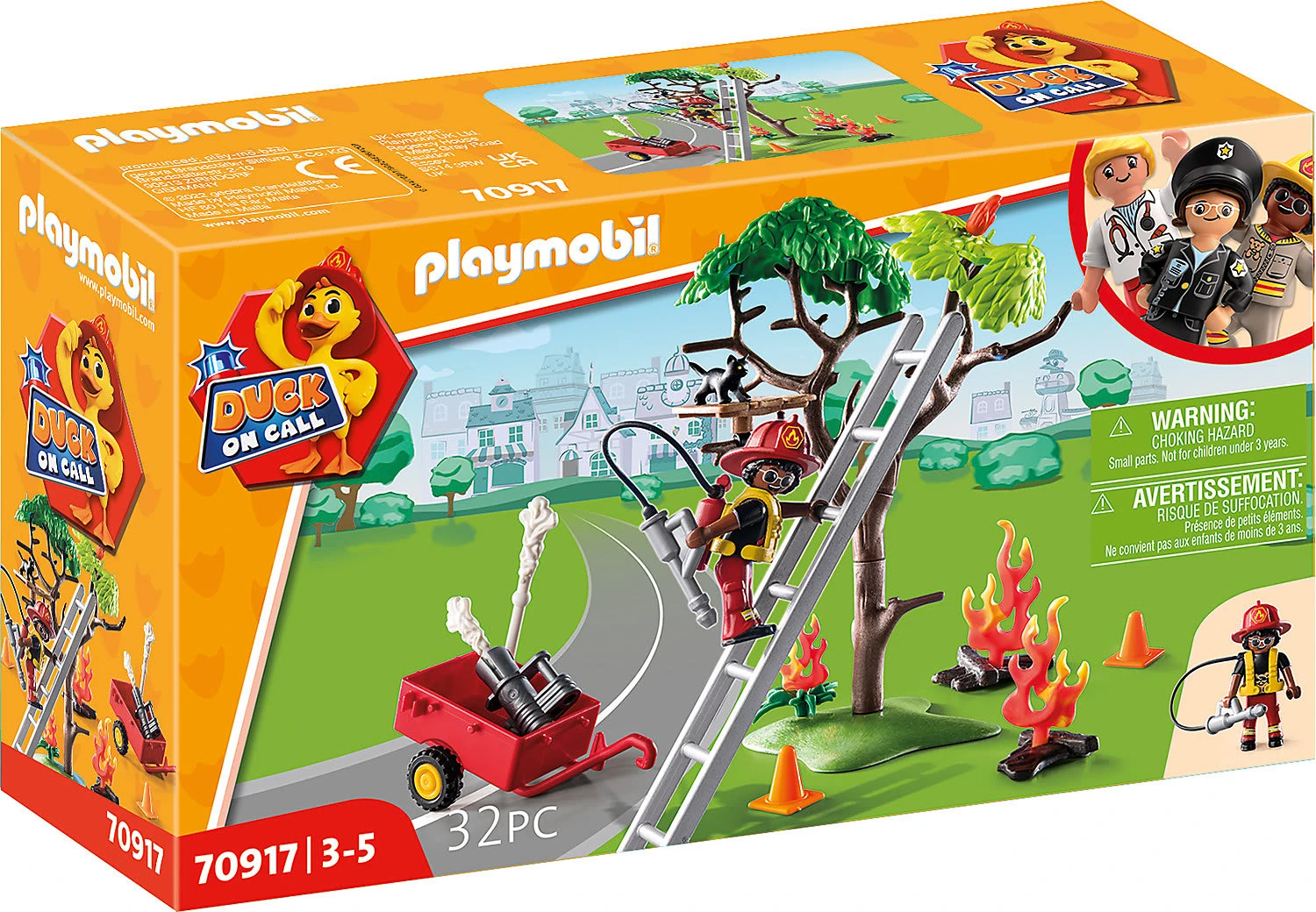 Die kleine Katze hat sich vor dem Feuer auf den Baum gerettet. Nun schafft sie es nicht mehr herunter. Mit dem Spieleset PLAYMOBIL® Duck on Call- Feuerwehr Action. Rette die Katze! (70917) kommt Hilfe für das Kätzchen. Die gut ausgestattete Feuerwehr kommt mit einer Leiter und leichtem Löschgerät, um die Flammen zu löschen und die Katze vom Baum zu retten. Mit dem Spieleset können kleine Nachwuchs-Rettungskräfte tolle Geschichten erfinden und umsetzen. In dem Set enthalten ist eine Spielefigur Feuerwehrmann und eine kleine Katzen-Figur. Außerdem ein Baum und viele Zubehörteile, wie eine schussfähige Löschkanone mit Schaummunition und aufstellbare Flammenelemente.