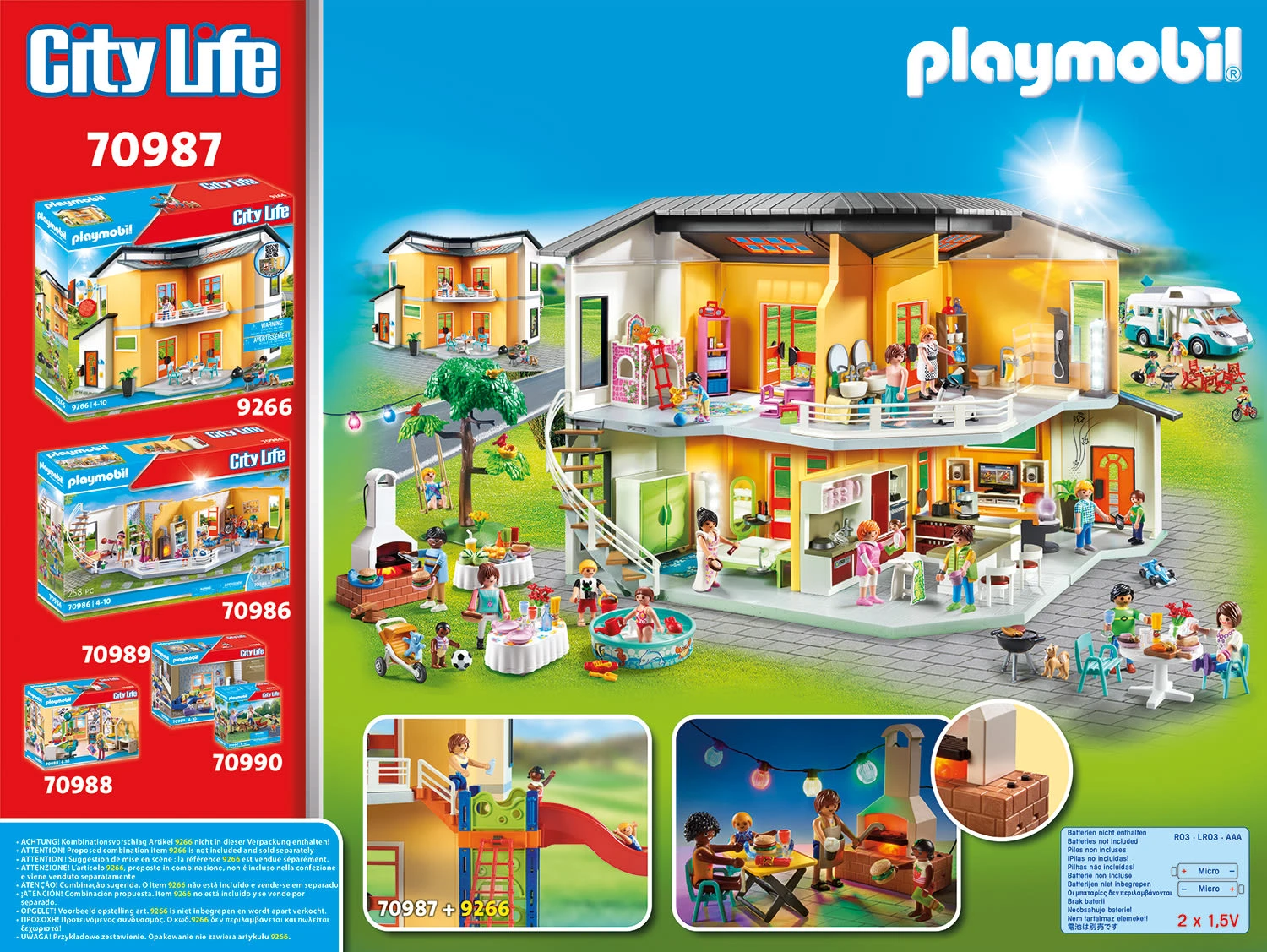 Bei der coolen Poolparty mit Rutsche ist beste Stimmung garantiert. Rauf auf das Klettergerüst und dann über die Wellenrutsche hinunter ins kühle Nass. Nach dem Badespaß können sich Hausbewohner und Gäste auf leckere Würstchen und Burger vom Grill freuen. Während die Kinder toben, entspannt sich Mama auf der Sonnenliege. Auch die Kaninchen im Freigehege sollen ihren Spaß haben und bekommen Wasser und frisches Futter. Abends wird die Lampionkette eingeschaltet und alle sitzen fröhlich zusammen und erzählen sich von den Abenteuern des Tages. Das Set enthält zwei PLAYMOBIL-Figuren und zwei Kinderfiguren, vier Kaninchen, einen Rutschenanbau, eine Lampionkette, einen Klapptisch, Stühle, Hotdogs, Burger und Getränke sowie viele weitere Extras für eine gelungene Party. Das Flackerlicht des Grills kann über einen Taster eingeschaltet werden. Der Pool ist mit Wasser befüllbar und kann sowohl einzeln aufgestellt als auch mit der Bodenplatte kombiniert werden.