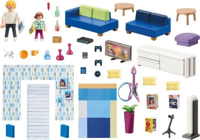 – Zubehör: 1 Sofa, 2 Tapeten, 3 Kissen, 2 Gamingcontroller, 1 Zeitschrift, 1 Tasse, 1 Untertasse, 1 Hocker, 2 Kaffeetische, 1 Bogen mit Klebepunkten, 1 Teppich, 4 Flaschen, 1 Parfümflasche, 3 Konsolenspiele, 1 Pflanze mit Blumentopf, 1 Tablet, 1 Stift, 1 E-Gitarre, 1 Gitarrenständer, 2 Hausschlappen, 1 Wohnzimmerregal, 1 Smartspeaker, 1 Spielekonsole, 1 Fernseher, 1 Briefstapel, 2 Ordner, 1 Lampe