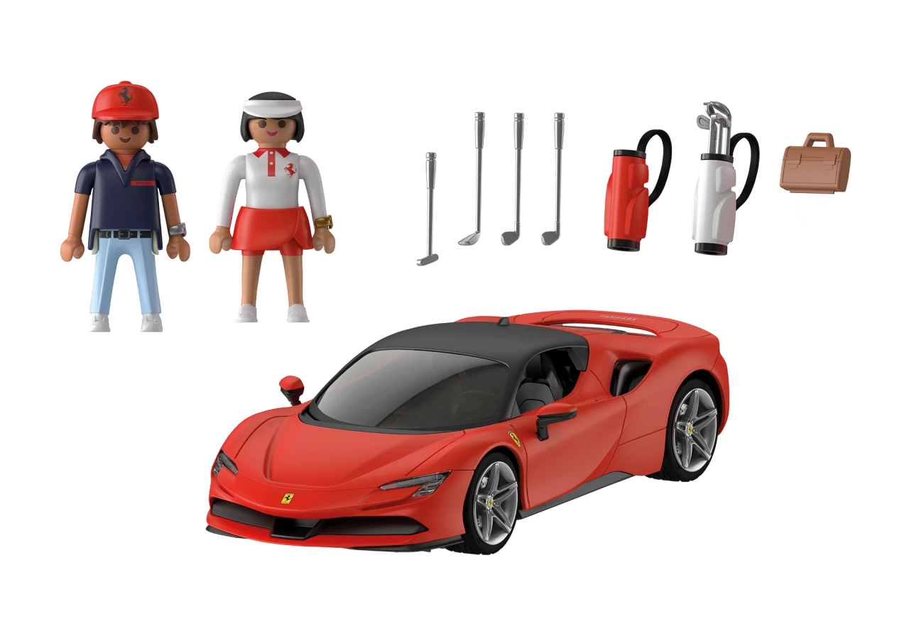 Zubehör: 1 Ferrari SF90 Stradale, 1 Reisetasche, 2 Golfbags mit Schlägern, 1 Schirmmütze Mann, 1 Schirmkappe Frau, 2 Armbanduhren