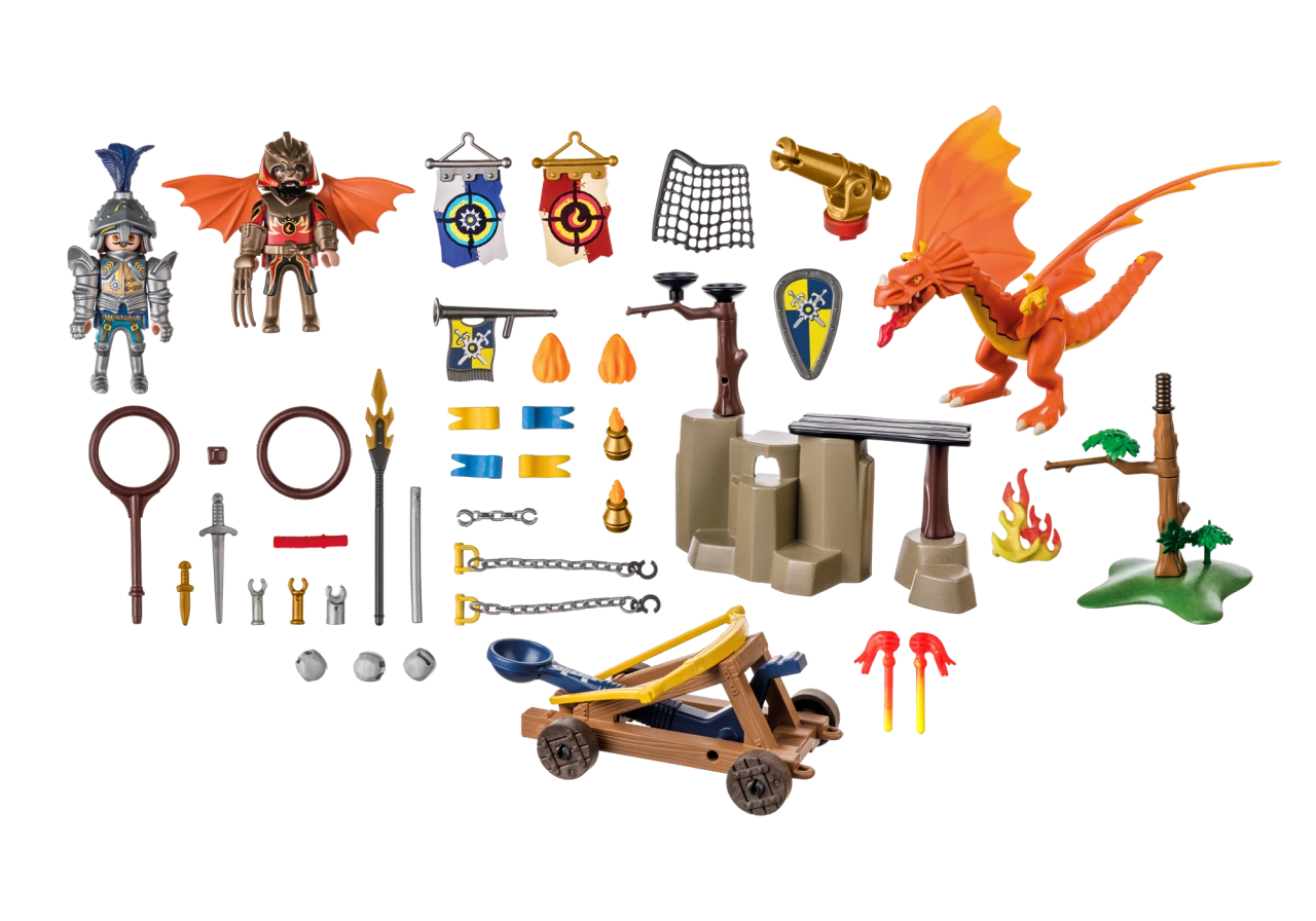Zubehör: 1 Bodenplatte, 1 Kanone mit Halter, 2 Feuergeschosse, 2 Felsen, 4 Holstämme, 2 Äste, 4 Feuerhalter, 2 Flammenkugeln, 2 kleine Flammen, 2 Holzbretter, 1 Flamme, 2 Textil-Fahnen mit Halter, 2 Zielringe mit Fahnen, 2 Pflanzen steckbar, 3 Katapult- Kugeln, 1 Katapult, 2 Ketten mit Griff, 2 Helme, 4 Armrüstungen, 1 Trompete, 1 Schild, 1 Schwert, 1 Speer, 1 Netz, 2 Flügel für Figur