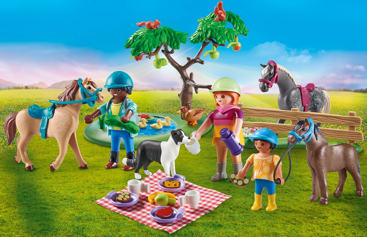 Zubehör: 1 Apfelbaum, 1 Teich, 1 Seerose, 1 Zaun, 1 Blumenwiese, 2 Helme, 1 Kinderhelm, 2 Sattel, 3 Halfter, 2 Zügel, 5 Äpfel, 1 Thermoskanne, 3 Brote, 1 Banane, 1 Picknickdecke