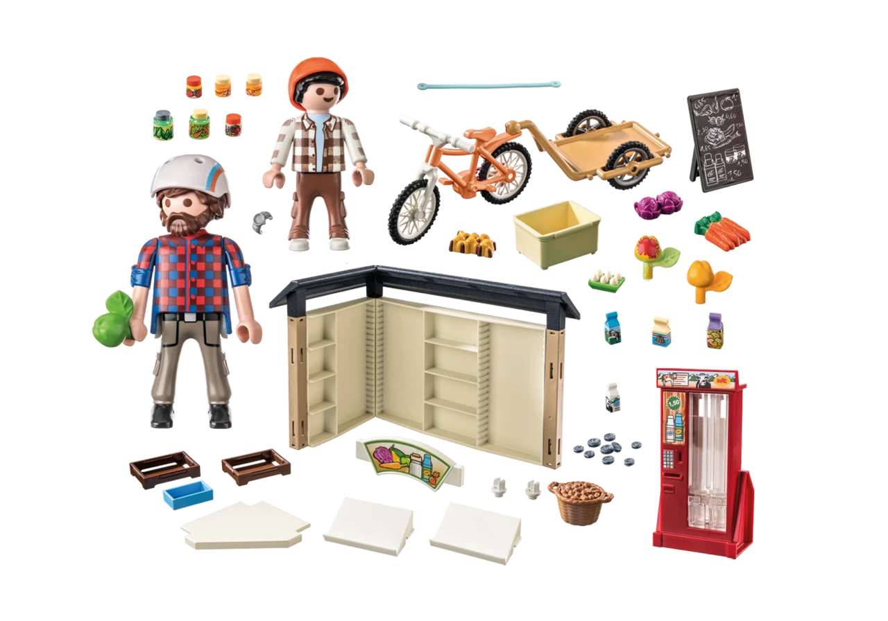 - Das 83-teilige PLAYMOBIL-Spielzeugset enthält zwei PLAYMOBIL-Figuren, einen Hofladen mit Milchautomat, Eier, Obst, Gemüse und verschiedene weitere Lebensmittel.