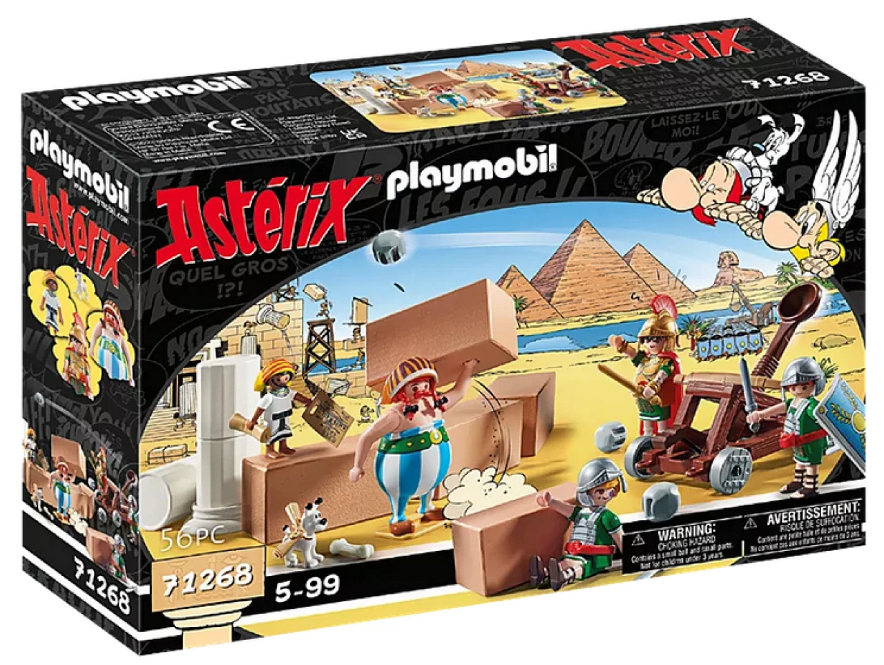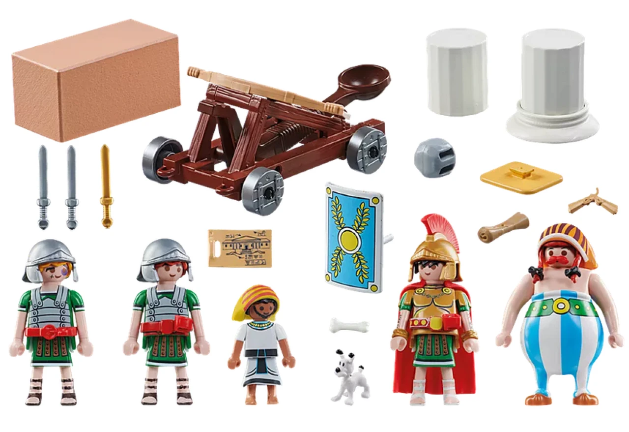- Das 56-teilige Asterix Spielzeugset enthält fünf PLAYMOBIL-Figuren Obelix, Numerobis, Idefix und 3 Römer, ein Katapult, Säulen, Steine und weitere Extras zum Nachspielen der Schlacht um den Palast.