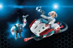 Sei dabei, wenn Dr. X, der selbstverliebte Herrscher von Technopolis auf seinem Skyjet von einem Ort zum anderen braust! Natürlich darf sein persönlicher Roboter Intercepto nicht fehlen, der sowohl stehen, sitzen und auch auf dem Skyjet Platz nehmen kann.