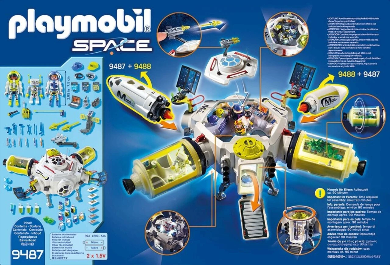Mars-Station mit zwei Astronauten, Roboter und funktionierender Doppelwaffe sowie vielfältigen Licht- und Geräuscheffekten (2 x 1,5-V-Micro-Batterien nötig). Mit viel Ausrüstung und Zubehör. Maße: 50 x 28 x 20 cm (LxTxH). Kombinierbar mit Art.Nr. 9488 Mars-Rakete mit Startrampe und 9490 Meteoroiden-Zerstörer.