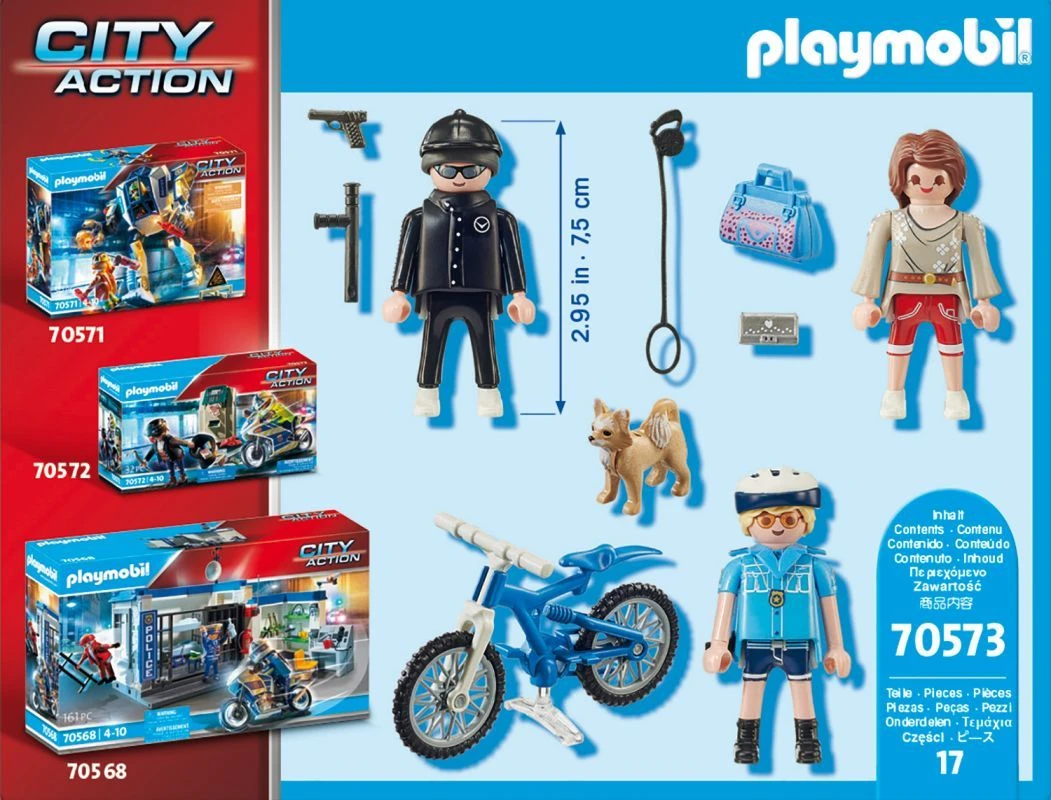 Handtaschenraub! Die Polizistin nimmt mit ihrem Fahrrad die Verfolgung des Taschendiebs auf.