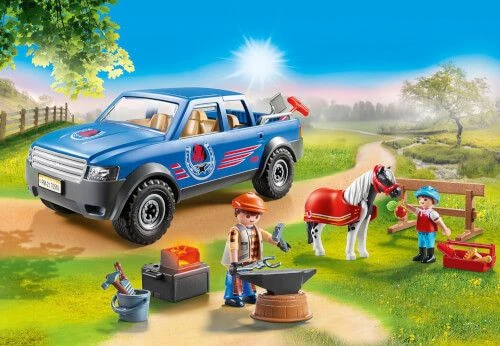 mit Fahrzeug und Ausrüstung sowie mobiler Feuerstelle zum Schmieden von Hufeisen. Das Feuer kann per Knopfdruck entfacht werden. Inkl. Pony und viel Zubehör. Maße Fahrzeug: 26 x 11 x 9,5 cm