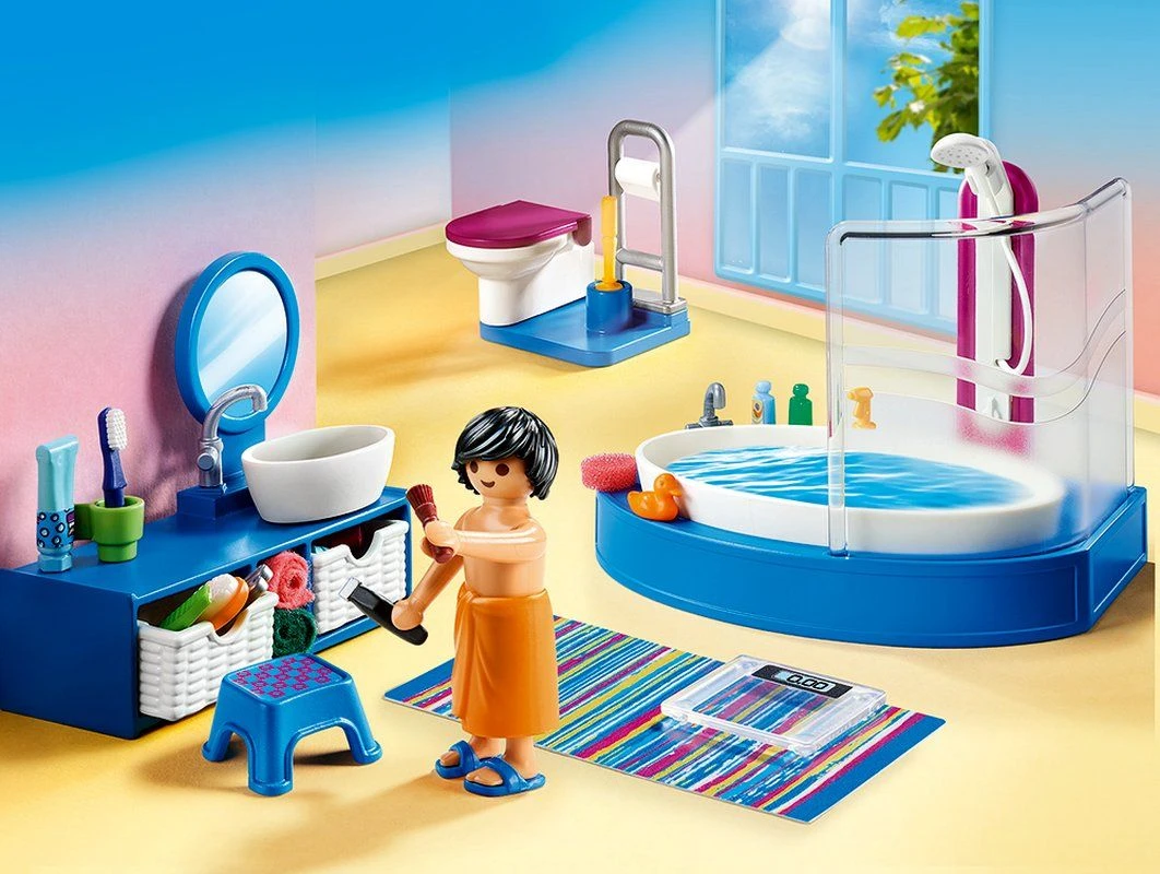 Dieses Badezimmer ist eine richtige Wohlfühloase für die ganze Familie! Die große Wanne lädt zum Duschen, Baden und Planschen ein. Mit einem Hocker kommen auch Kleinkinder zum Waschbecken und im Schrank ist viel Platz für Handtücher, Kamm, Rasierer und Föhn. Das Spielset enthält eine männliche PLAYMOBIL®-Figur, eine Bdewanne mit integrierter Dusche, einen Waschtisch mit Körben, eine Toilette mit separatem Kinderaufsatz, eine Waage und viele weitere Badezimmerutensilien. Das Badezimmer passt perfekt ins Große Puppenhaus Art.Nr. 70205. Die neue PLAYMOBIL®-Spielwelt Puppenhaus lädt mit liebevollen Details zum kreativen Rollenspiel rund um das Familienleben ein.