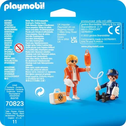 Manchmal braucht auch die Polizei Hilfe. Die eifrige Polizistin ist gestürzt und hat sich am Kopf verletzt. Zum Glück ist der Notarzt gleich zur Stelle, um einen Verband anzulegen. PLAYMOBIL DuoPacks bieten doppelte Spielfreude. Zwei Figuren mit Accessoires sorgen für kleine und große Spielabenteuer.